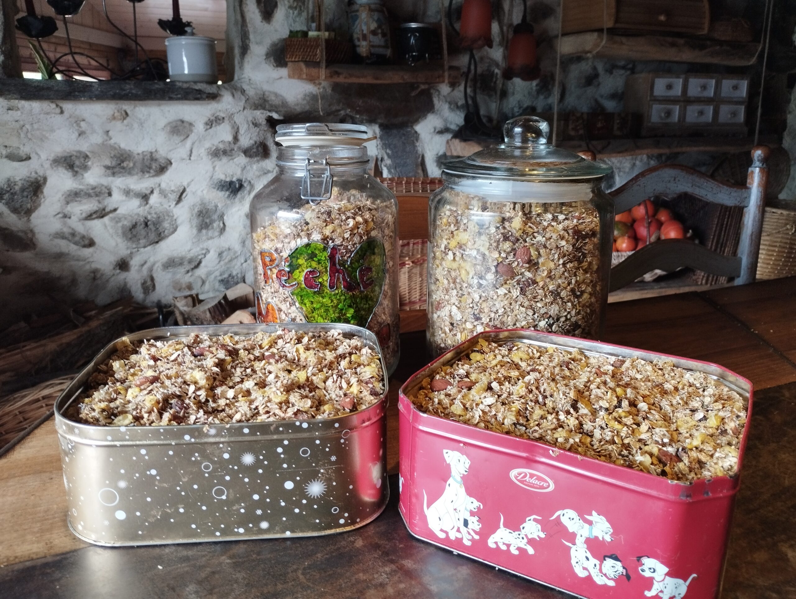 Adossés aux pierres centenaires, assis sous la charpente de mélèze nous partagerons notre table d’hôte: cuisine équilibrée, inventive majoritairement BIO. Pancakes, yaourts & confitures . Spécialités fromagères l’hiver.